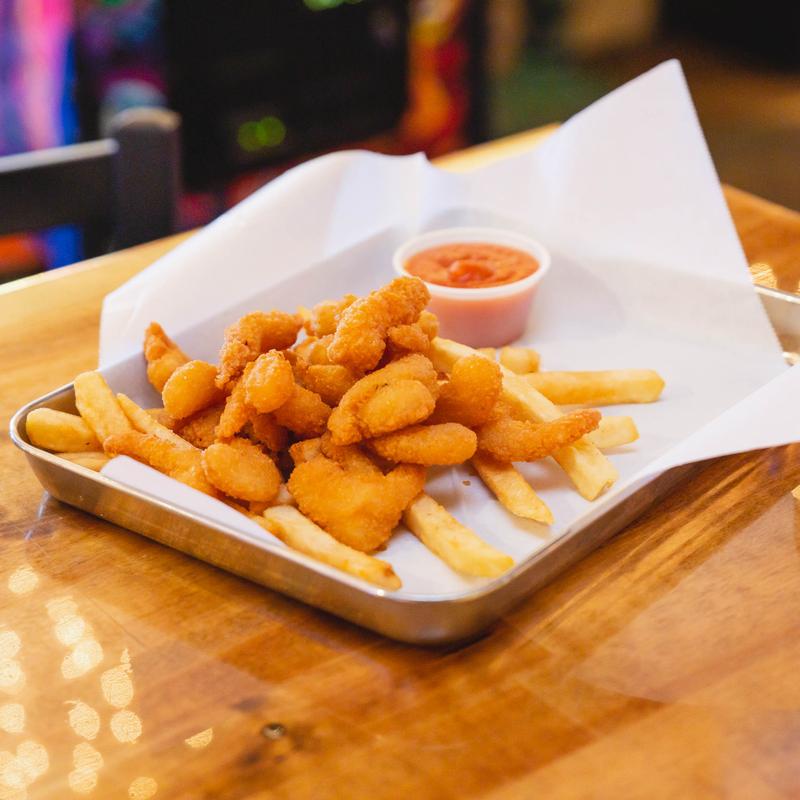 Breaded shrimp with fries & cocktail sauce.