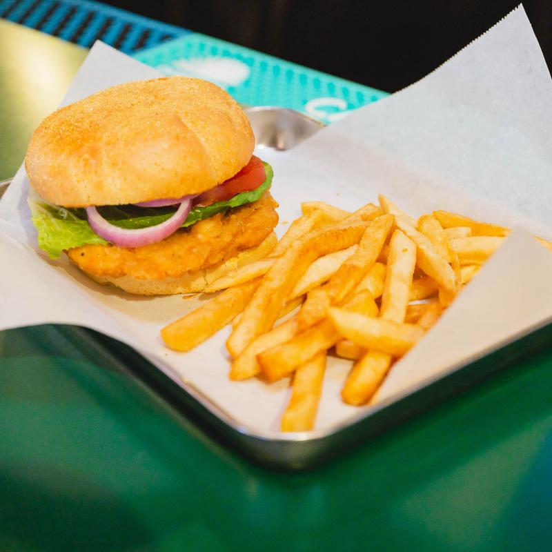 Large chicken filet fried golden brown with lettuce, tomato, onion, Colby-Jack cheese & mayo on a brioche bun.