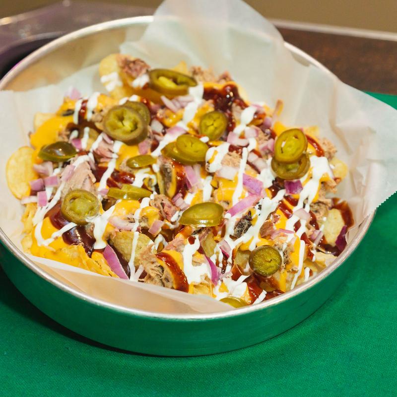 Pork BBQ, kettle cooked potato chips, pub cheese, red onions, BBQ sauce, sour cream & jalapeños!